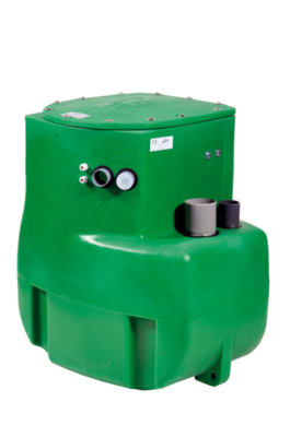 Station livrée complète : 1 pompe monophasée, clapet à boule, vanne, système de relevage avec barres de guidage, couvercle étanche.
