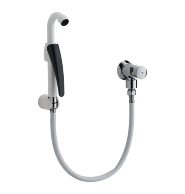 Le robinet lave-bassin, grâce à la douchette ergonomique, permet le nettoyage d'une cuvette, d'un vidoir ou le nettoyage de parties intimes. Avec robinetterie à fermeture automatique temporisée