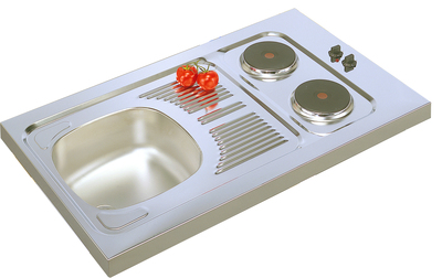 Evier réversible en inox 18/10 lisse, 1 cuve soudée, égouttoir forme "pétale", 2 plaques électriques intégrées, vidage complet et raccord lave-vaisselle